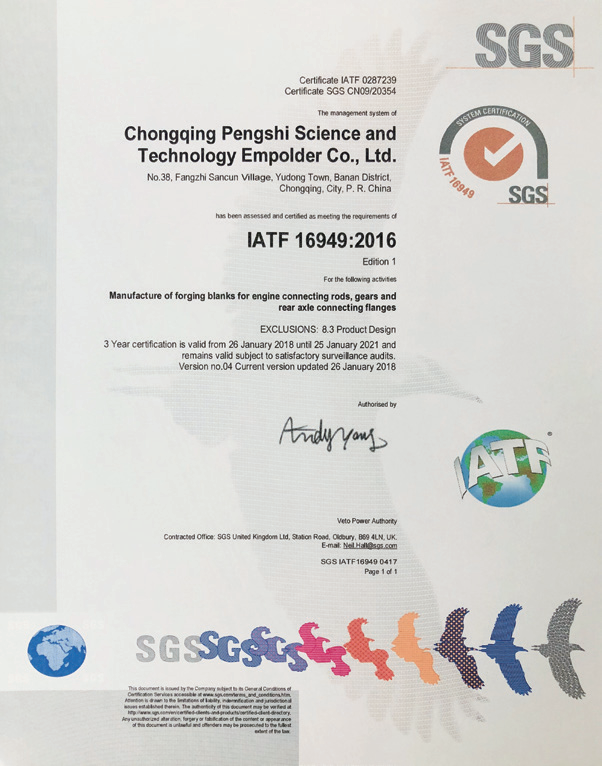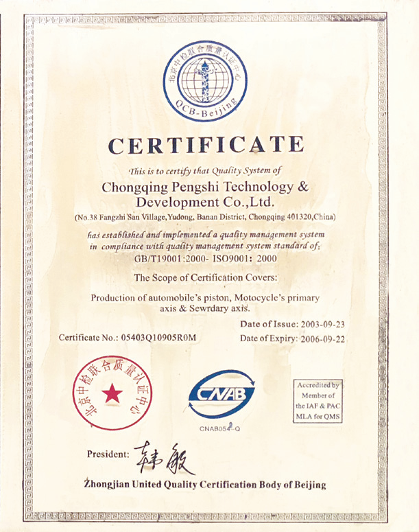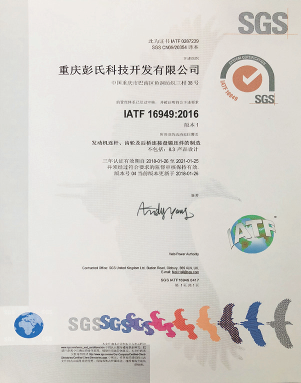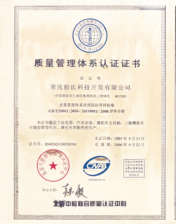 公司产品已经通过了ISO/TS16949 质量体系认证。在多年的经营下,公司在市场中建立了良好的信用及声誉,保证了企业的健康发展,同时曾荣获重庆市巴南区“诚信企业”、 “先进私营企业”等荣誉称号并被行业评为“优秀单位”。
